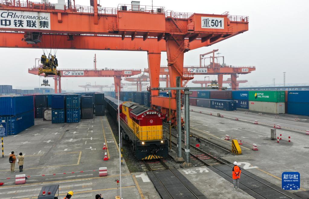 1月22日,兔年首趟西部陸海新通道鐵海聯運班列在重慶團結村中心站等待發車(無人機照片)。