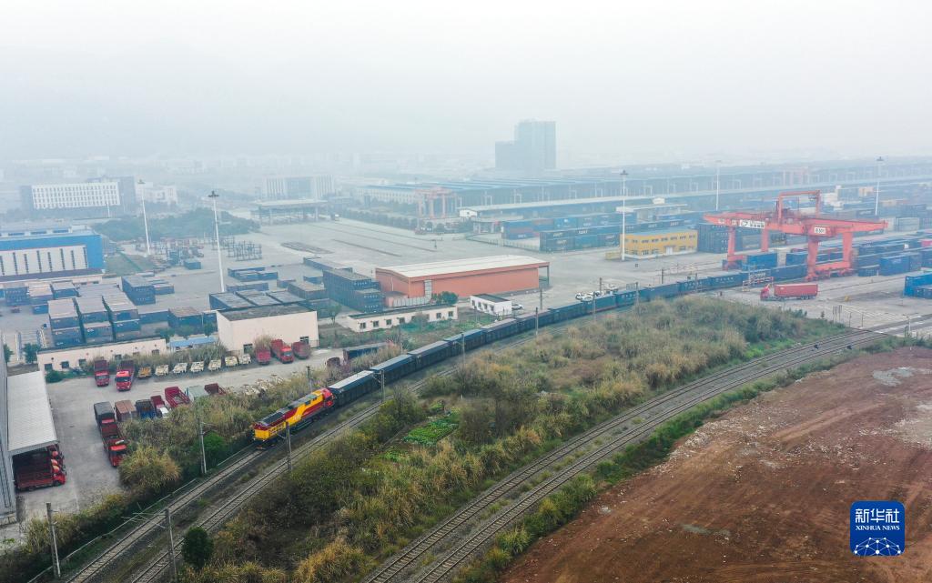 1月22日,兔年首趟西部陸海新通道鐵海聯運班列從重慶團結村中心站發車(無人機照片)。