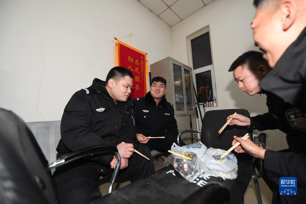 河北唐縣公安局特巡警大隊(duì)隊(duì)員在吃年夜飯(1月21日攝)。
