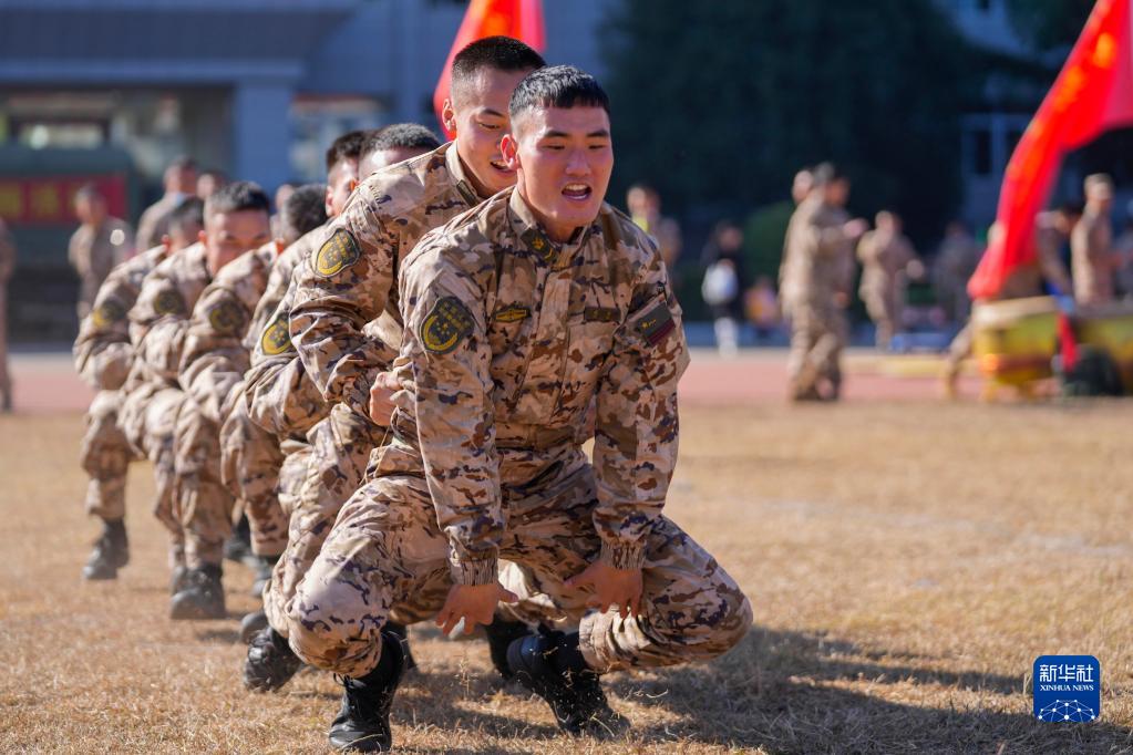 1月22日,武警第二機(jī)動(dòng)總隊(duì)某支隊(duì)在營(yíng)區(qū)開展新春游園活動(dòng),官兵們齊心協(xié)力進(jìn)行“兔子跳跳”小游戲。