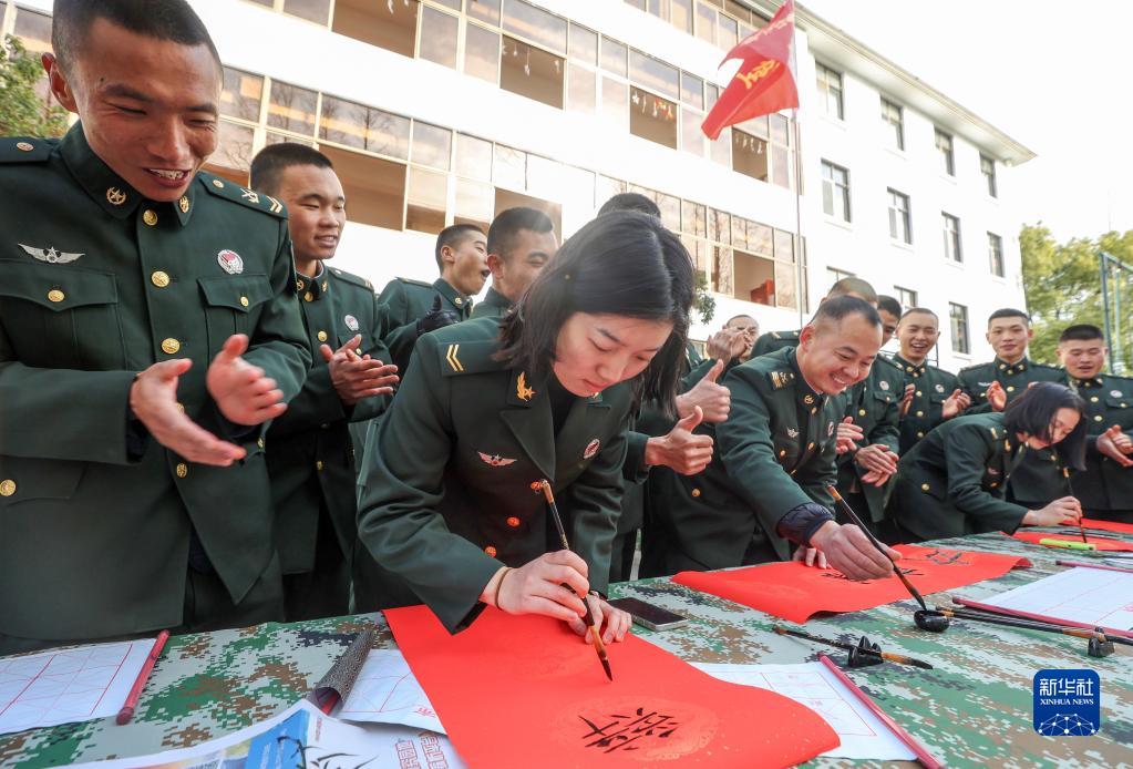 1月21日,第72集團軍某旅組織官兵寫春聯裝扮營區,喜迎新春佳節。