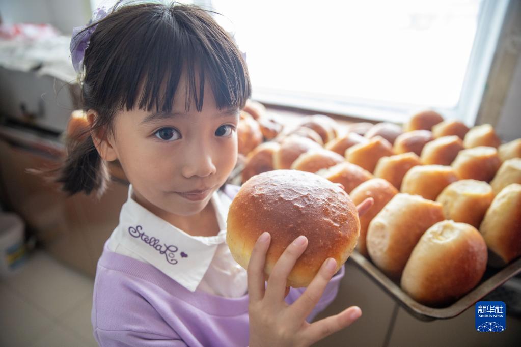 1月12日,一名小朋友在黑龍江省漠河市北紅村“最北面包房”內(nèi)展示面包。