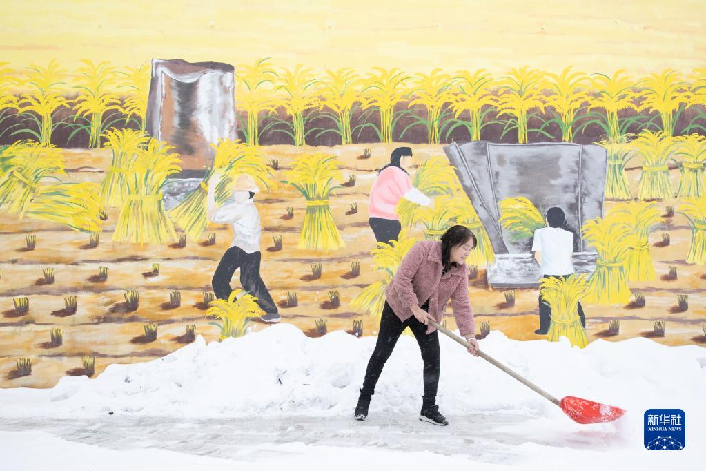 1月12日,在黑龍江省漠河市北紅村“遠(yuǎn)方故里”民宿,負(fù)責(zé)人張翠花在清理積雪。
