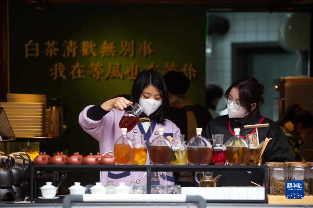 1月22日,在貴州省安順市西秀區(qū)安順古城歷史文化街區(qū),一家茶飲店鋪工作人員在為顧客準(zhǔn)備茶飲。