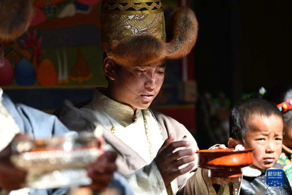 次旦老人的孫子在喝青稞酒(1月22日攝)。