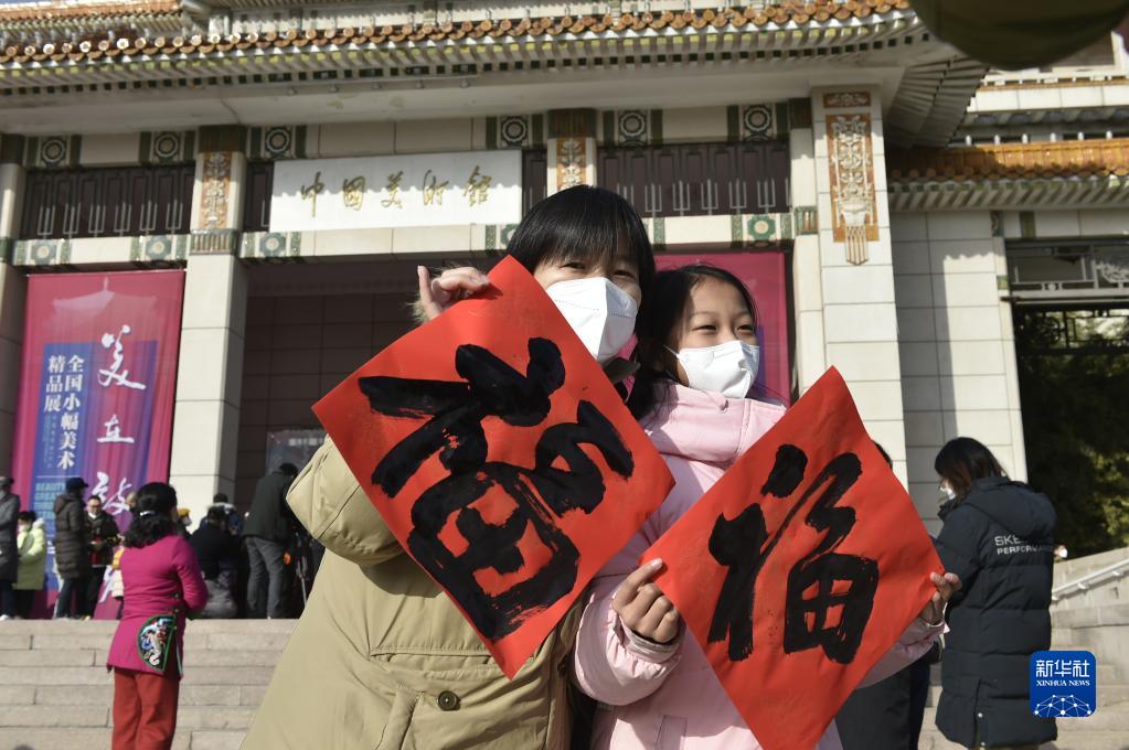 1月22日,觀眾在中國美術館前廣場展示剛領到的“福”字。