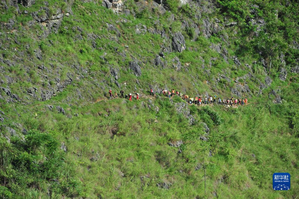 蒙宣任、蒙宣汰兄弟和同學結伴走在回家的山路上(2012年7月4日攝)。