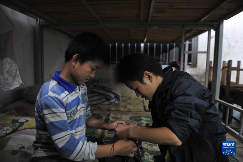 在弄勇小學學生宿舍,蒙宣任(左)在縫衣服(2014年5月3日攝)。