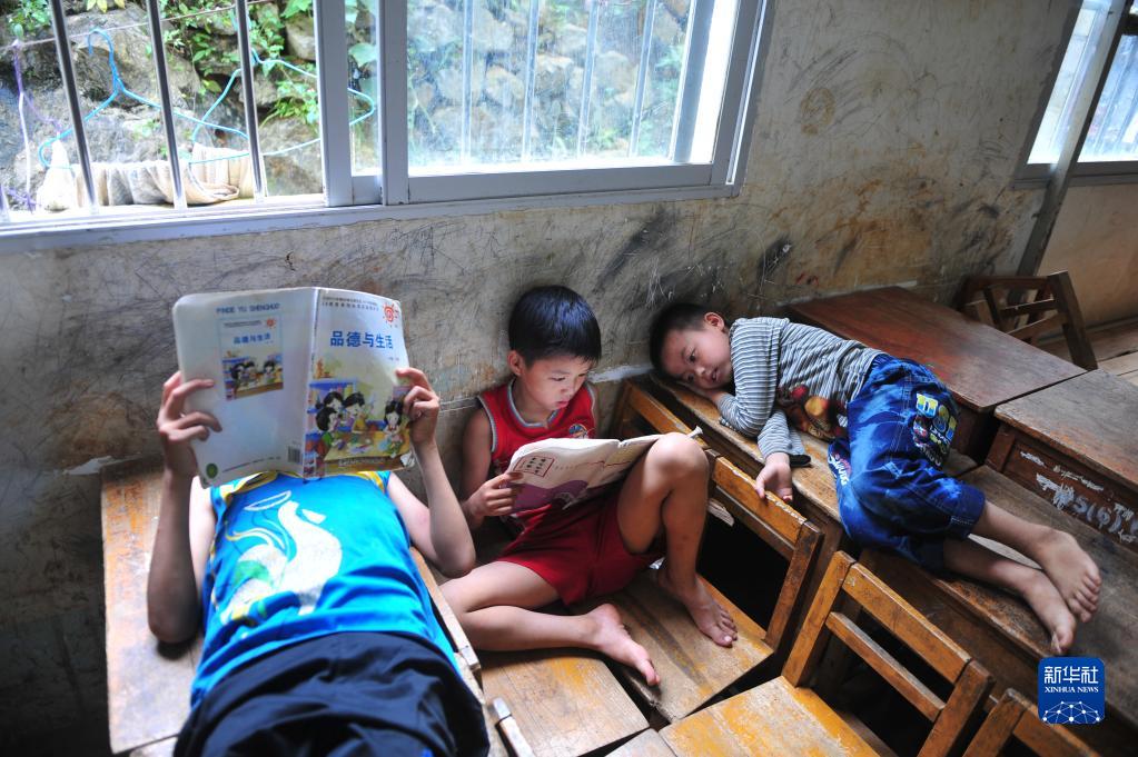 在大化瑤族自治縣板升鄉弄勇小學,讀三年級的蒙宣汰(中)在午休前學習(2014年7月2日攝)。