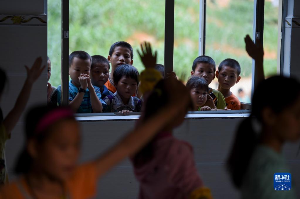 在弄勇小學,蒙宣汰(右二)在聲樂室外觀看同學排練文藝節目(2015年5月14日攝)。