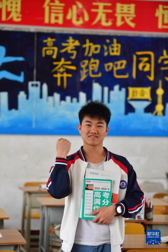在大化瑤族自治縣高級中學,高考前的蒙宣任為自己加油鼓勁(2021年3月17日攝)。