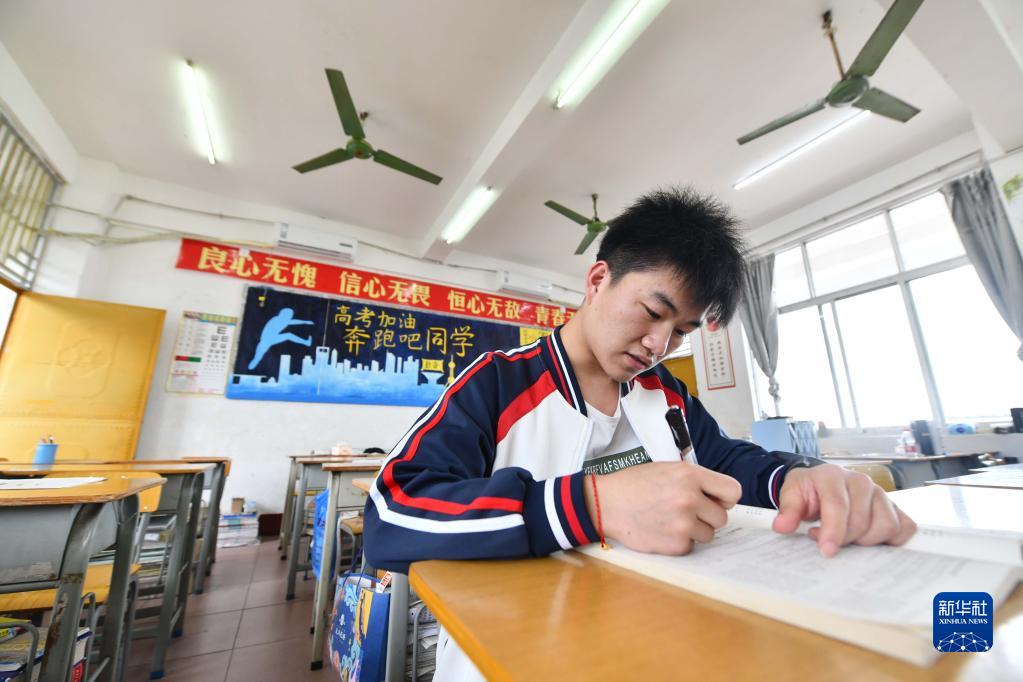 在大化瑤族自治縣高級中學,高考前的蒙宣任在備考(2021年3月17日攝)。