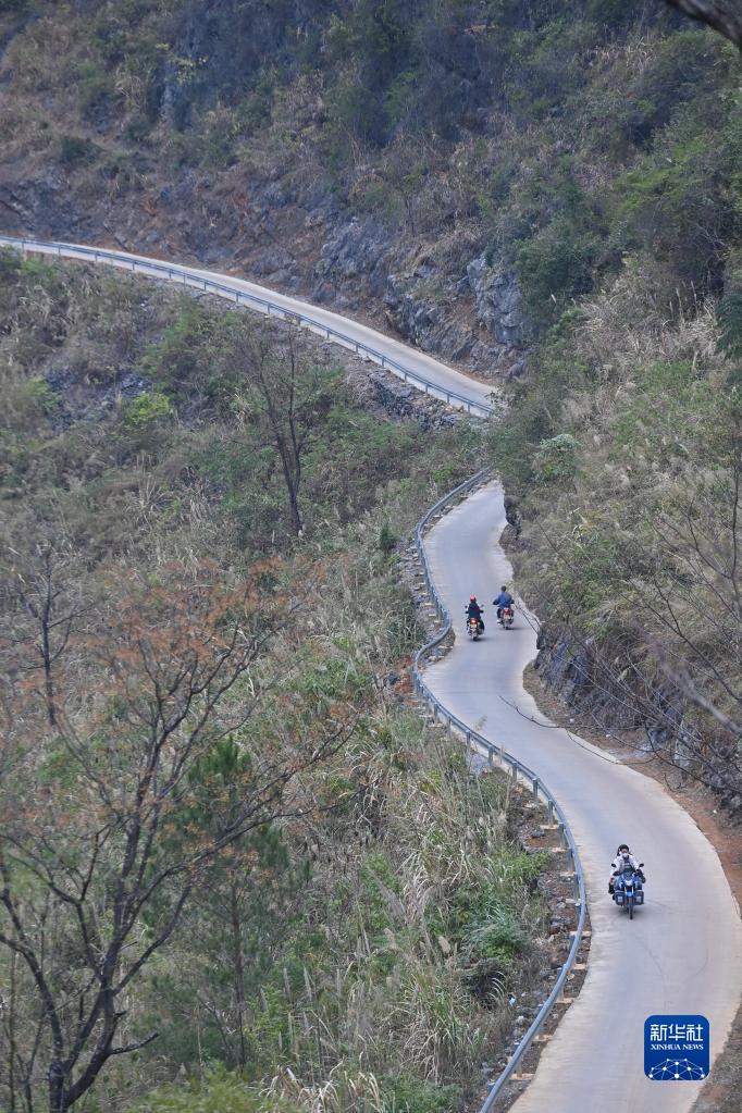蒙宣汰(上右)和朋友騎摩托車回家(2023年1月20日攝)。曾經(jīng)上學(xué)必經(jīng)的山路,在2016年修通了水泥路。