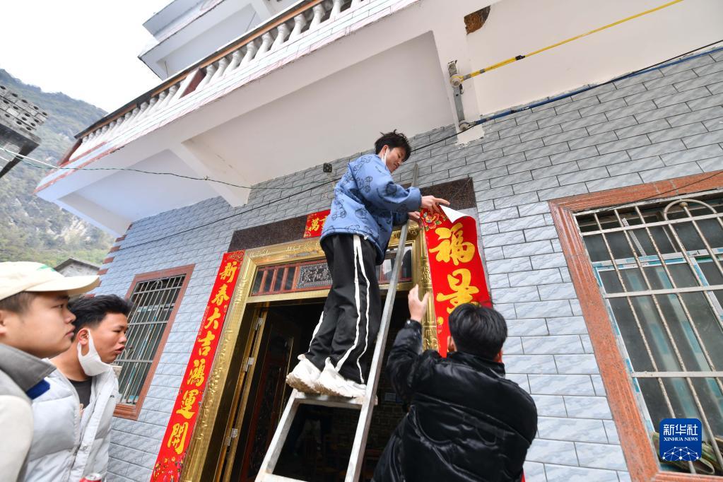 在大化瑤族自治縣板升鄉(xiāng)弄勇村弄頂屯,蒙宣汰(上)在貼對聯(lián)(2023年1月21日攝)。