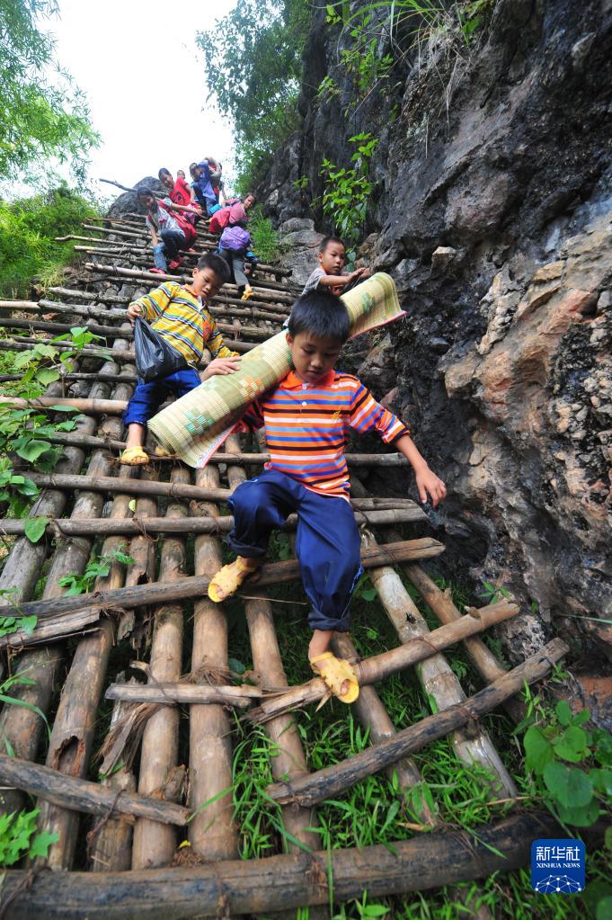 在大化瑤族自治縣板升鄉弄勇村弄頂屯,四年級學生蒙宣任背著生活用具,爬“天梯”去上學(2012年9月3日攝)。