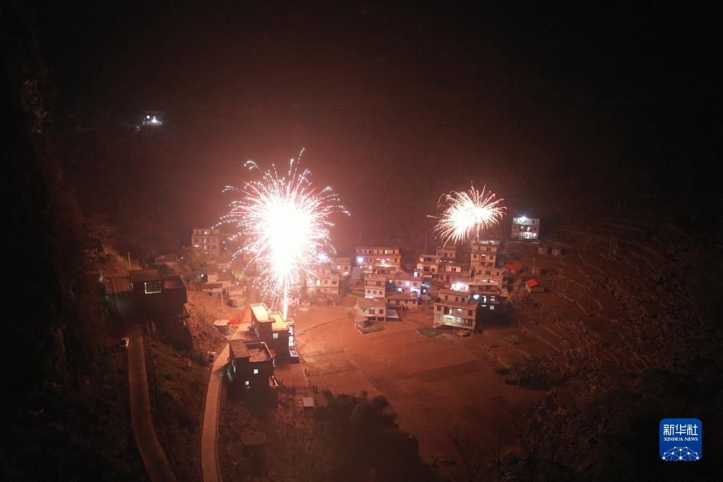 大化瑤族自治縣板升鄉弄勇村弄頂屯除夕夜景(2023年1月21日攝,無人機照片)。