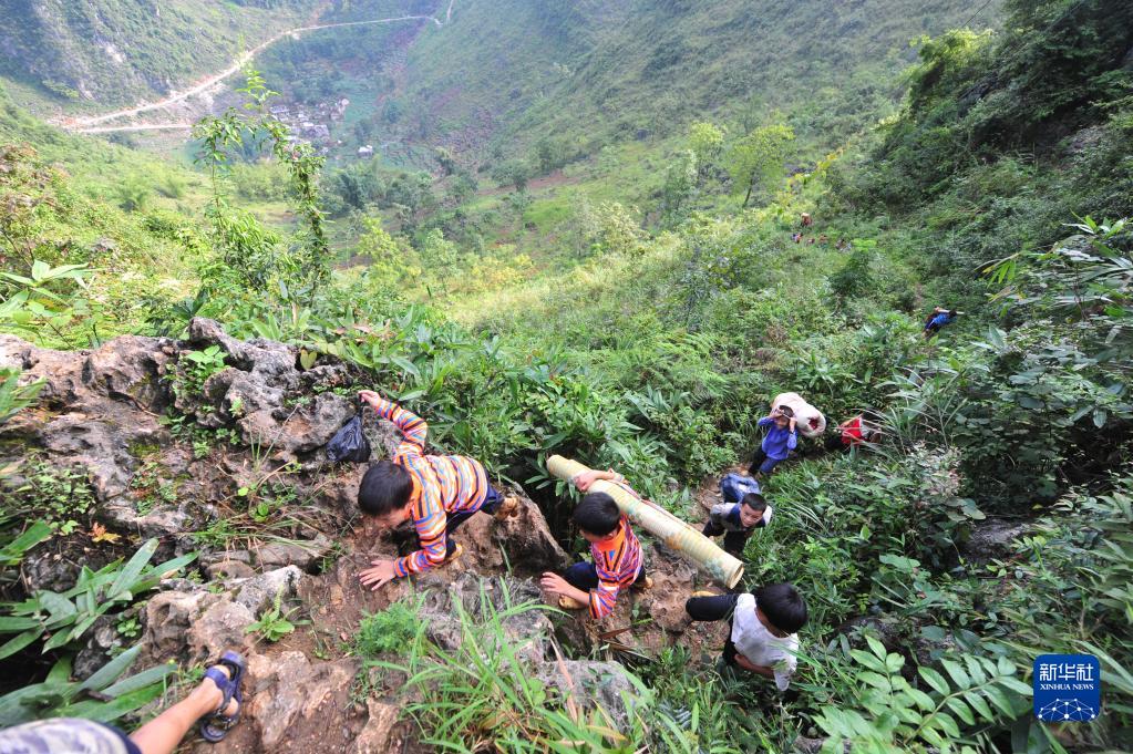 在大化瑤族自治縣板升鄉弄勇村弄頂屯,蒙宣汰(左一)、蒙宣任(左二)爬山路去學校(2012年9月3日攝)。