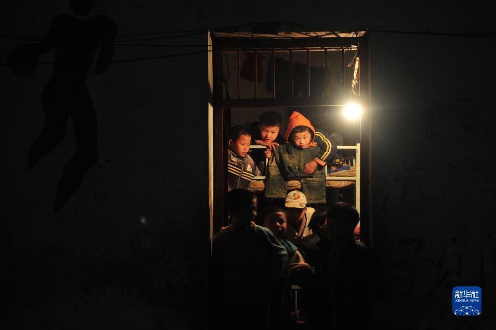 在弄勇小學讀二年級的蒙宣汰(上右)和同學在宿舍里準備睡覺(2012年12月26日攝)。