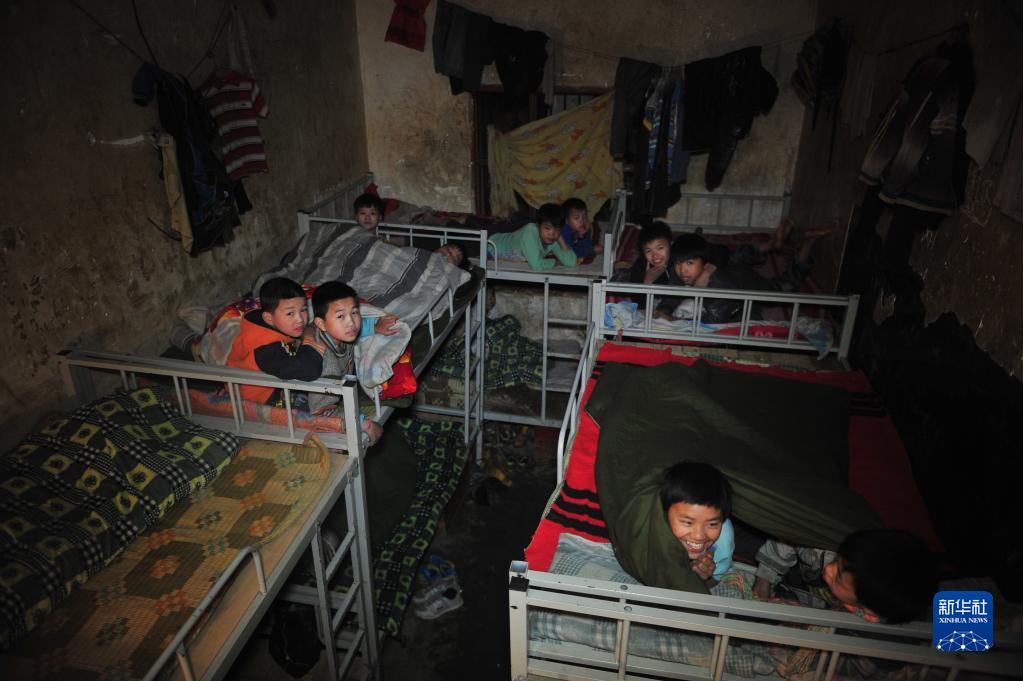 在弄勇小學(xué)學(xué)生宿舍,蒙宣汰(左一)、蒙宣任(左二)在宿舍里準(zhǔn)備睡覺(2012年12月26日攝)。如今“大通鋪”已成為歷史。