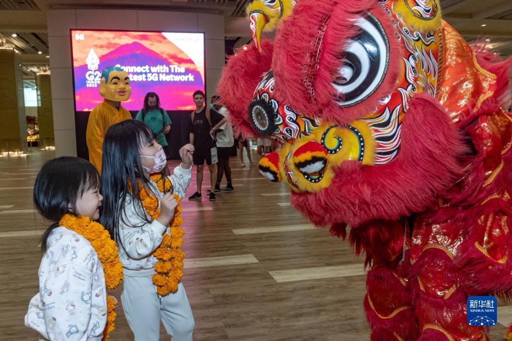 1月22日,在印度尼西亞巴厘島伍拉萊國際機場,中國小游客與舞獅互動。