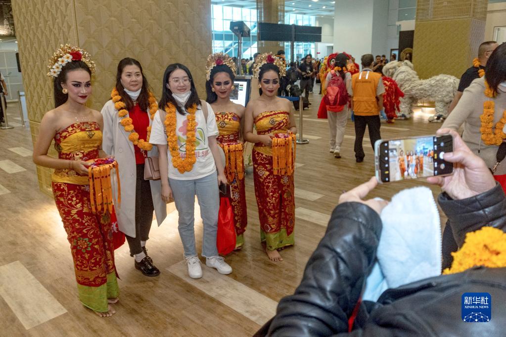 當(dāng)天,旅游勝地巴厘島迎來(lái)2023年首架中國(guó)游客包機(jī)。乘客從中國(guó)深圳飛抵巴厘島后,在機(jī)場(chǎng)受到熱烈歡迎。