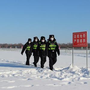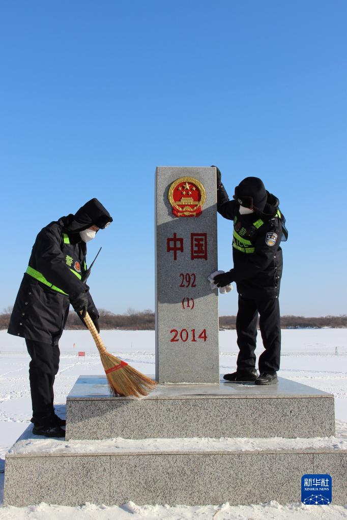 1月22日,雞西邊境管理支隊(duì)虎頭邊境派出所的移民管理警察在清掃界碑。