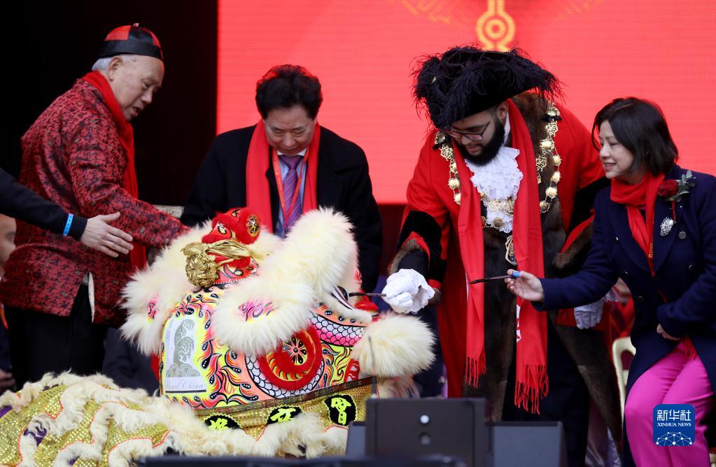 1月22日,在英國倫敦市中心的特拉法加廣場,嘉賓在春節慶典上為獅子“點睛”。