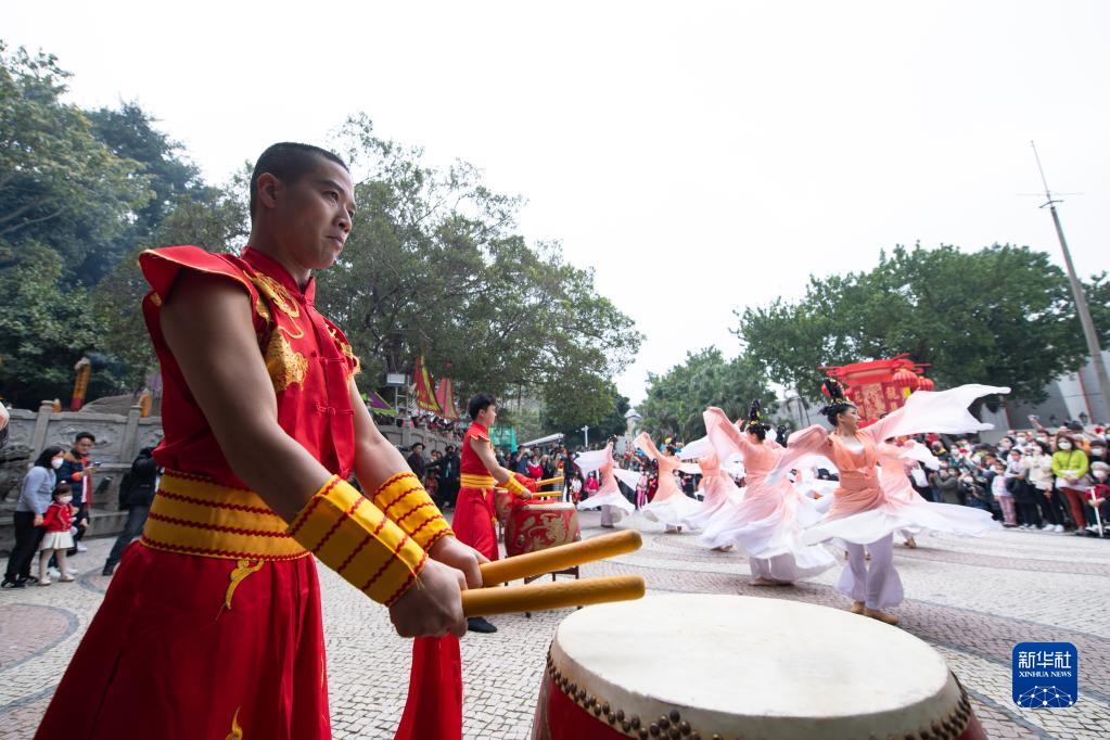 1月23日,演員在澳門媽閣廟前表演鼓樂舞。