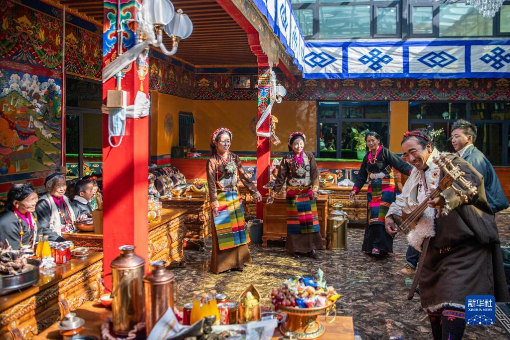 在藏歷農(nóng)家年的家庭聚會中,人們彈奏扎念琴(1月23日攝)。