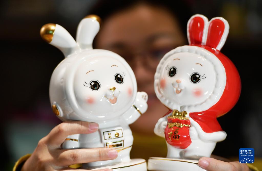 一名市民展示福建省泉州市德化縣陶瓷廠生產的陶瓷版兔年吉祥物“兔寶(右)和兔墩”(1月23日攝)。