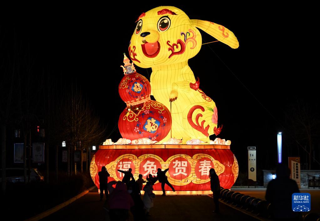 人們在寧夏吳忠市鹽池縣九曲民俗文化園觀賞兔子造型花燈(1月22日攝)。
