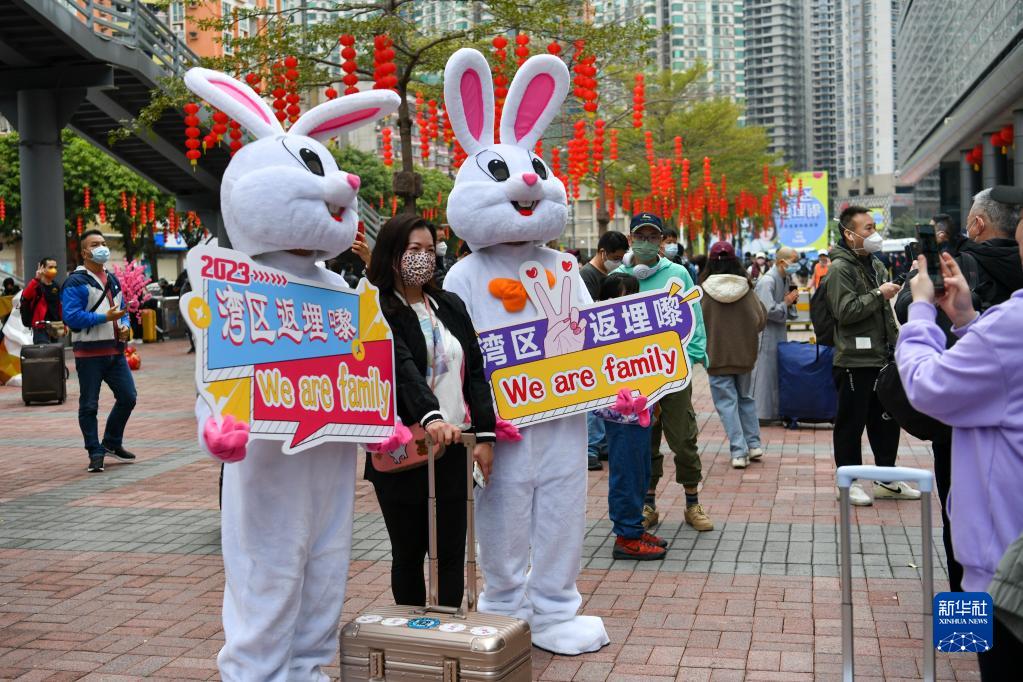 在深圳福田口岸外,兩只兔子人偶歡迎從香港返深的人們(1月8日攝)。