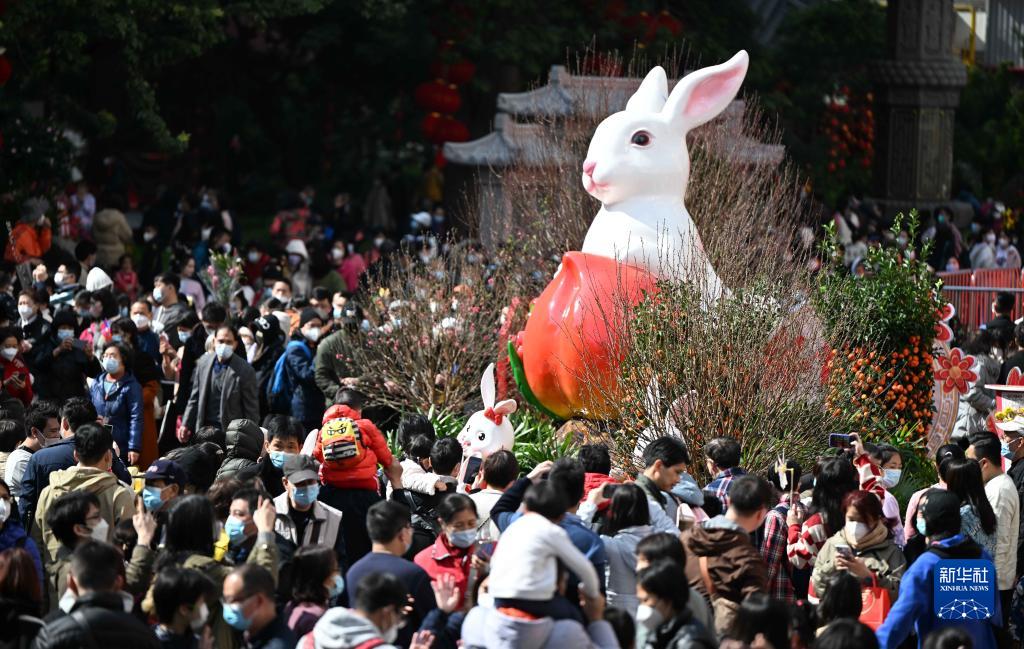 廣州越秀西湖花市的兔子形象景觀花壇(1月19日攝)。