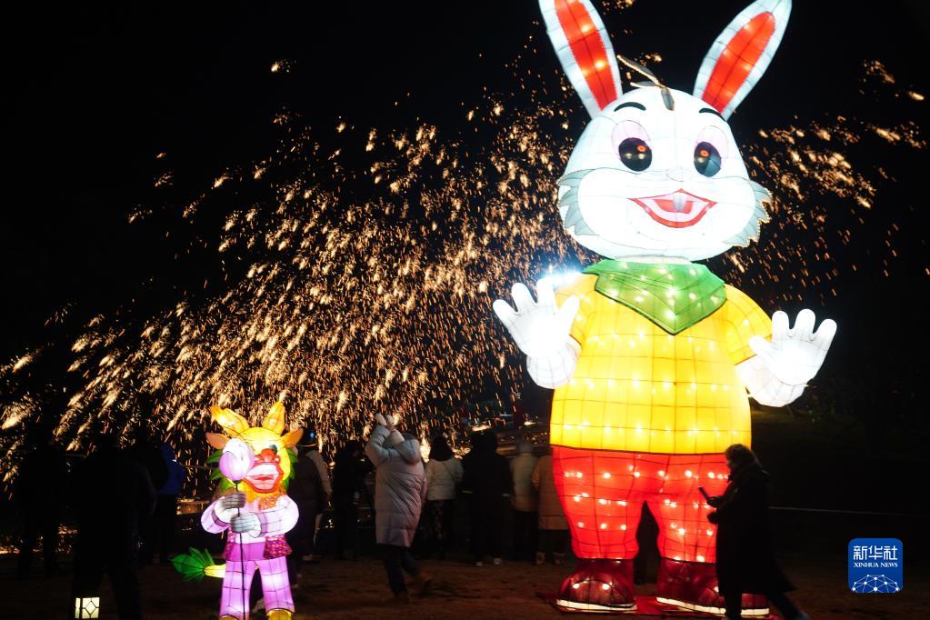 1月23日,在江蘇省淮安市盱眙縣第一山歷史文化街區(qū)崖壁廣場(chǎng)大型兔燈旁,游人觀看打鐵花表演。
