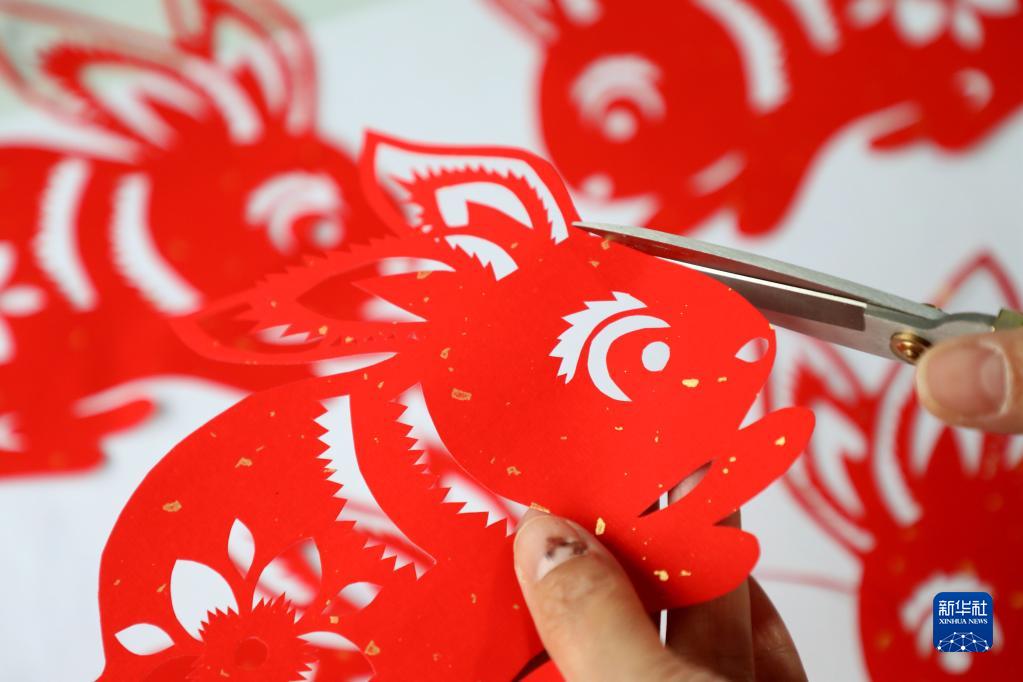 山東省濱州市惠民縣李莊鎮(zhèn)民間藝人在創(chuàng)作生肖兔剪紙作品(1月13日攝)。