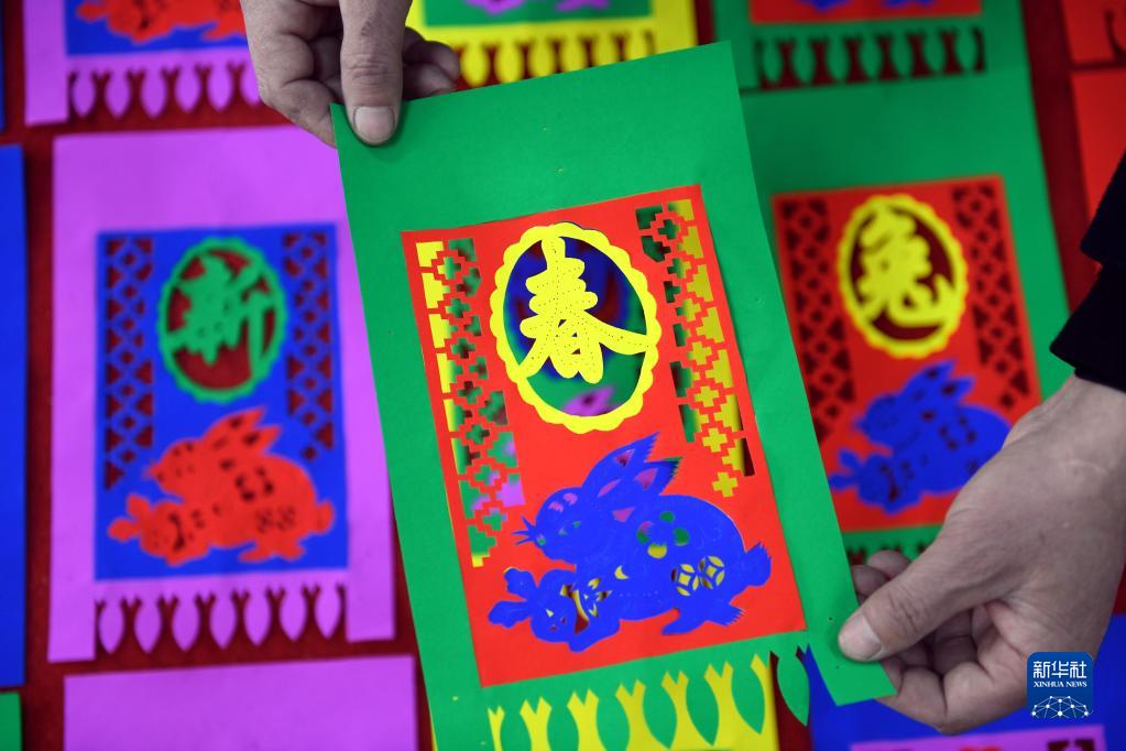 山東省臨沂市郯城縣馬頭鎮(zhèn)民間藝人張乃蒼展示制作的掛門箋“玉兔迎新春”(1月15日攝)。