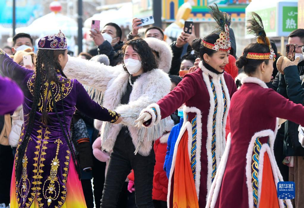 1月23日,在烏魯木齊大巴扎景區(qū),游客和演員一起跳起歡快的麥西來甫。