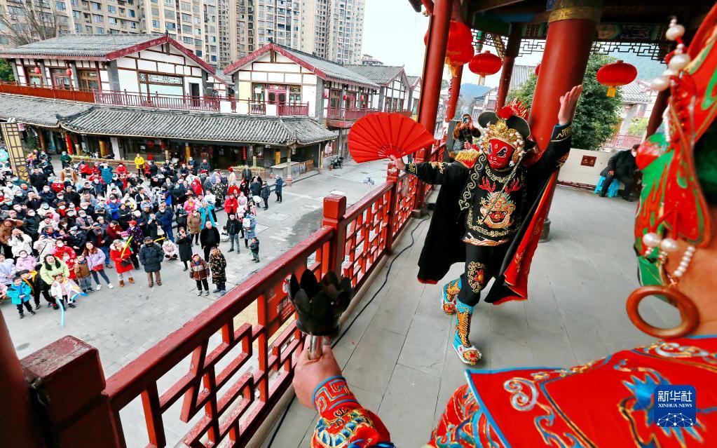 1月23日,在四川省遂寧市西部唐都,川劇演員為市民表演川劇絕活“變臉吐火”。