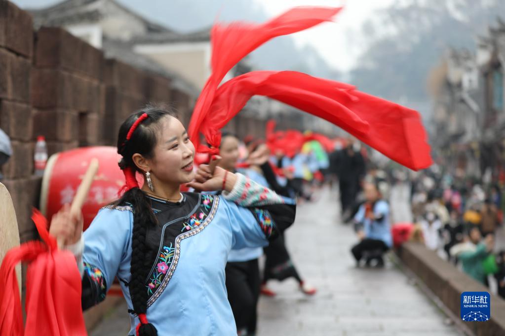 1月23日,在湖南省湘西土家族苗族自治州鳳凰古城,演員在進行苗鼓表演。