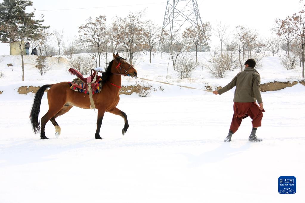 1月23日,在阿富汗首都喀布爾,一名男子牽馬從雪地上走過。