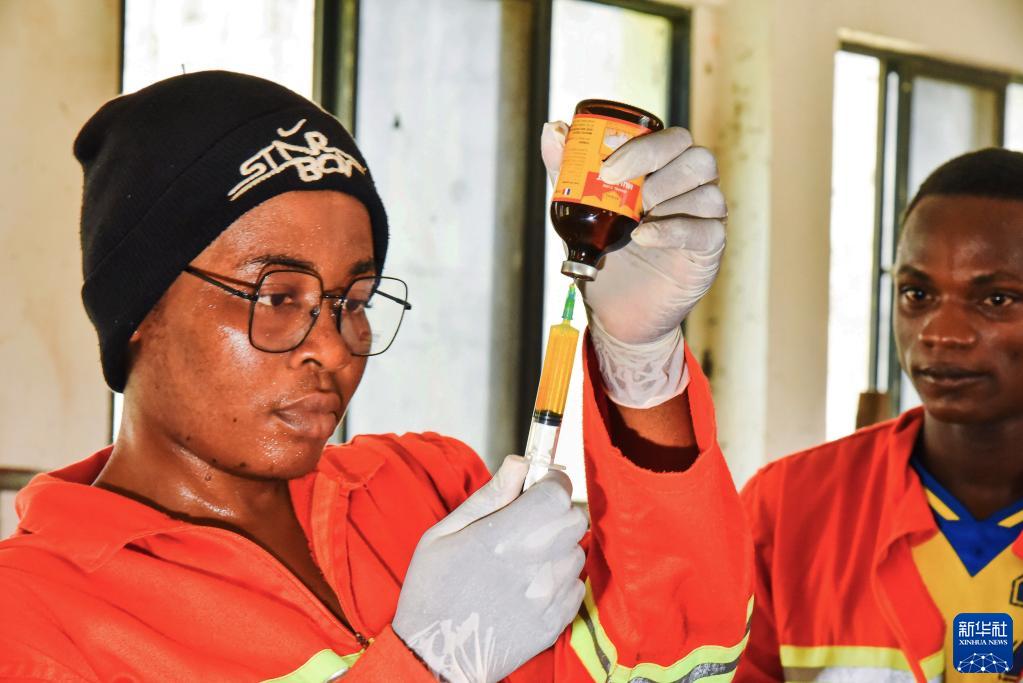 1月12日,在喀麥隆亞巴西,一名學生在農業職業技術中學準備給牲畜注射疫苗。