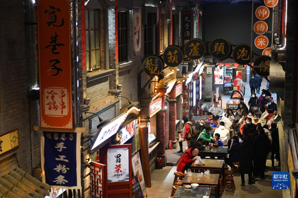 1月24日,市民在位于陜西省咸陽市的福園巷子街區游覽,品味特色美食。