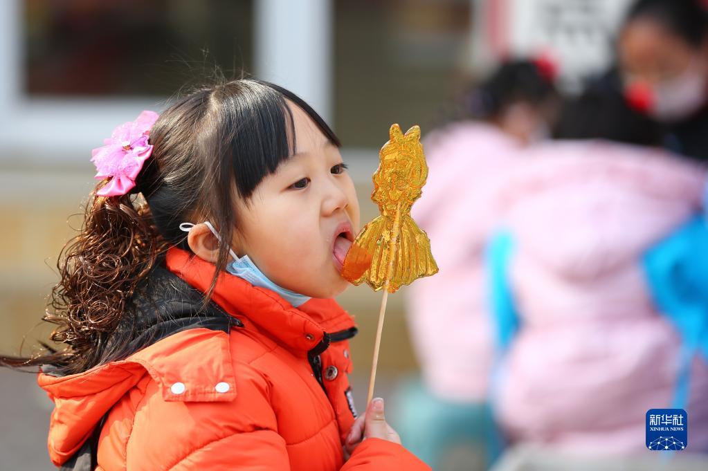 1月22日,一名小女孩在山東省滕州市西崗鎮品嘗糖畫。