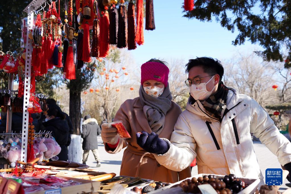 1月24日,張珍妮和丈夫在北京八大處公園舉辦的第十屆八大處新春文化廟會(huì)游玩。