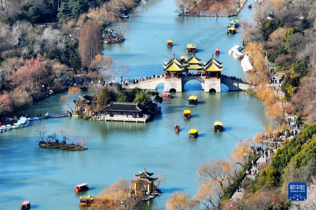 1月24日,游客在江蘇揚州瘦西湖風景區(qū)游覽(無人機照片)。