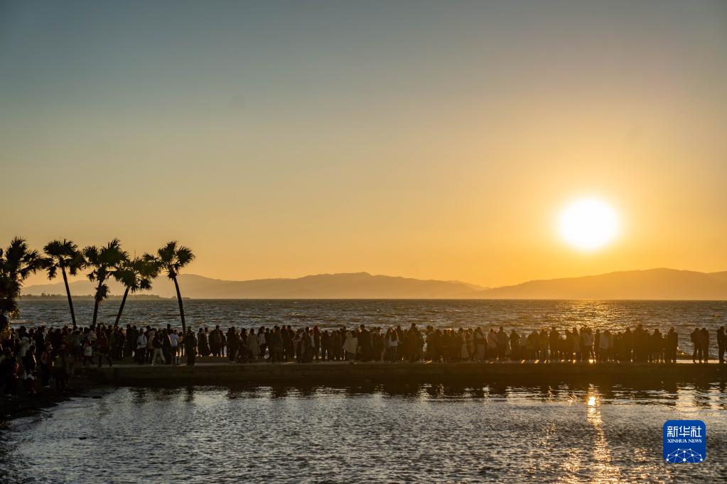 1月22日,游客在云南省昆明市觀賞滇池日落。