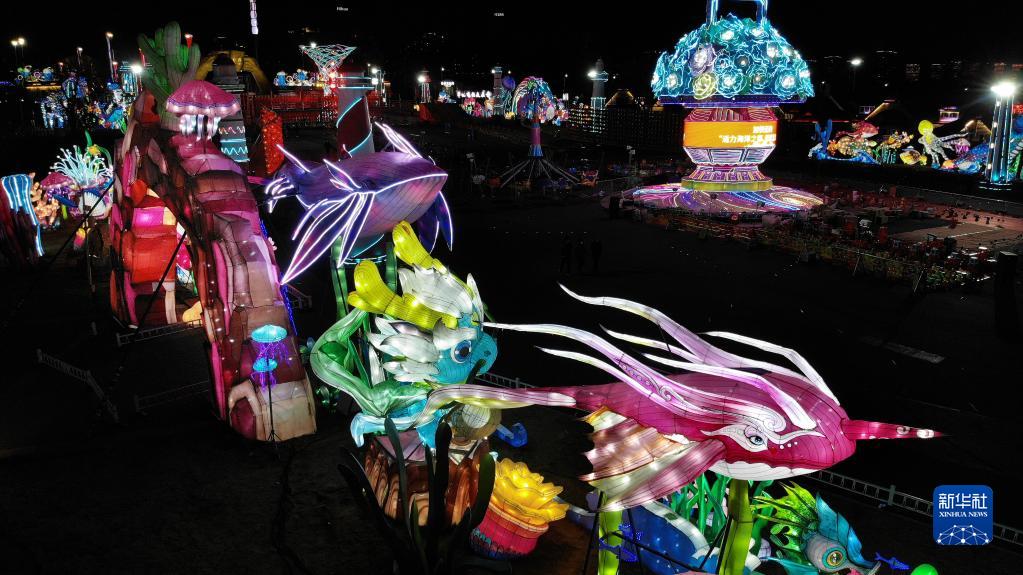 1月24日在青島金沙灘啤酒城內拍攝的海洋主題彩燈(無人機照片)。
