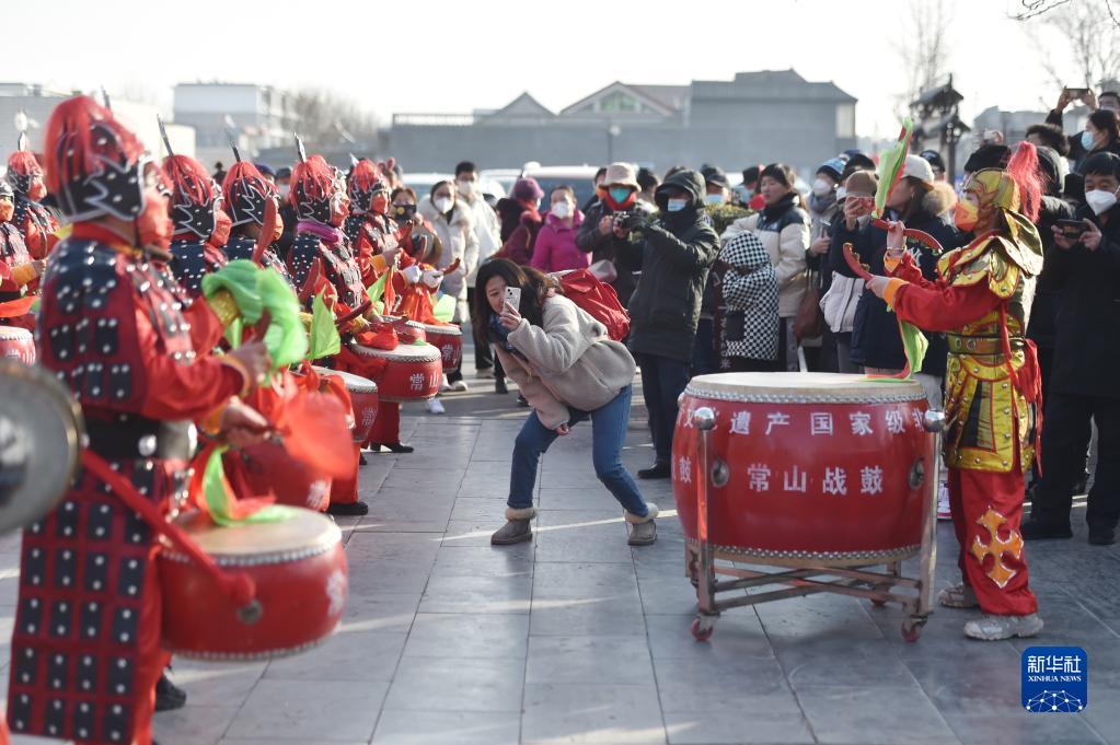 1月25日,在河北省石家莊市正定古城隆興寺景區(qū)的傳統(tǒng)文化演出上,游客欣賞“常山戰(zhàn)鼓”。