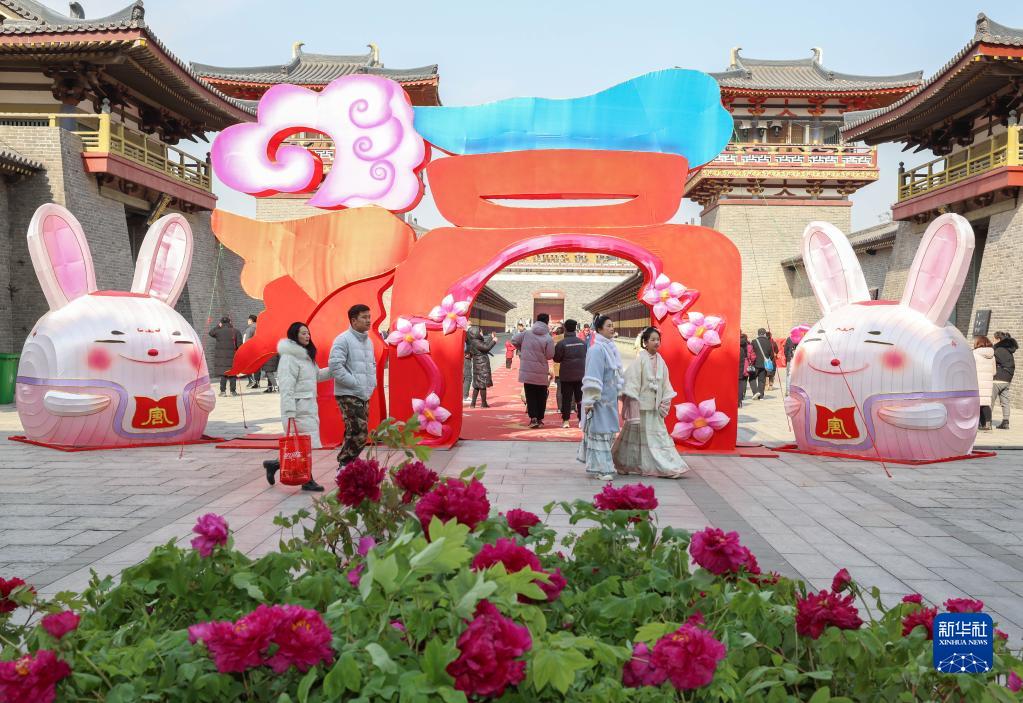 1月25日,游客在湖北省襄陽市唐城春節(jié)廟會游覽兔年主題花燈。