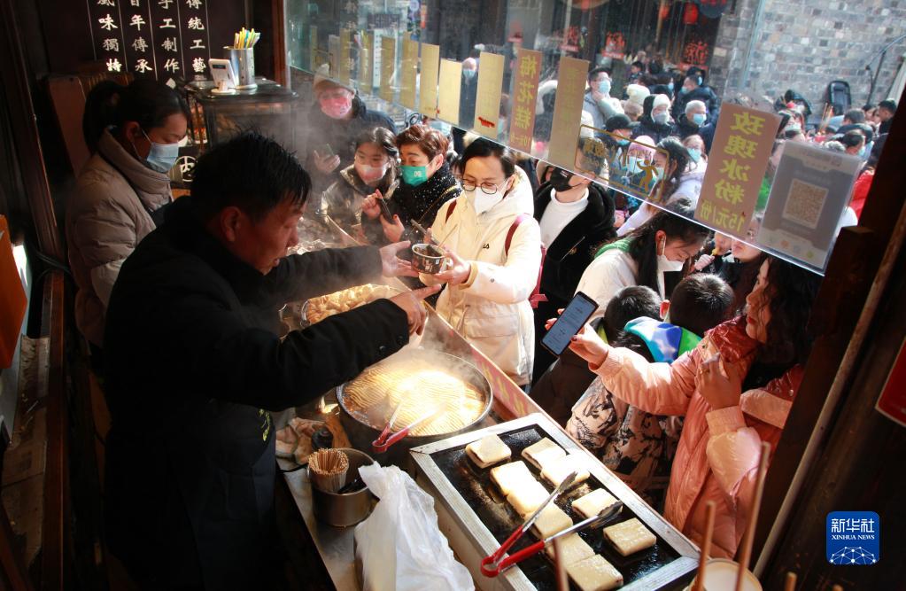 1月24日,顧客在南京老門東的小吃攤位購買特色美食。